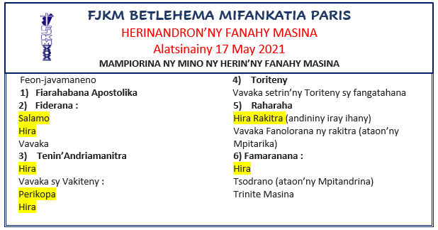 FJKM Betlehema Mifankatia Paris Ny Mpitandrina RASOAVIMBAHOAKA Fanjanavalona tel: 07 49 43 23 85