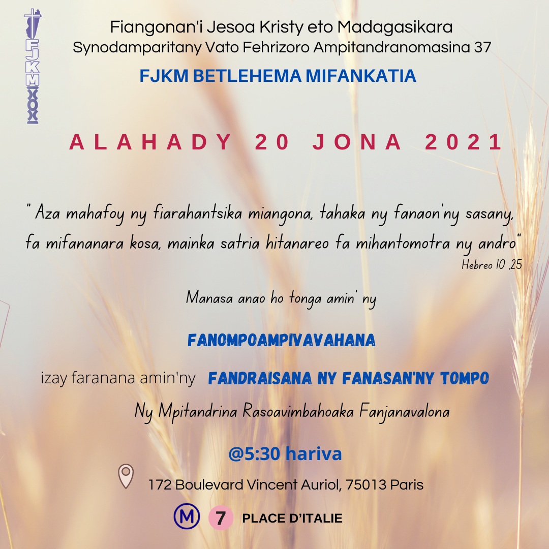 FJKM Betlehema Mifankatia Paris Ny Mpitandrina RASOAVIMBAHOAKA Fanjanavalona tel: 07 49 43 23 85