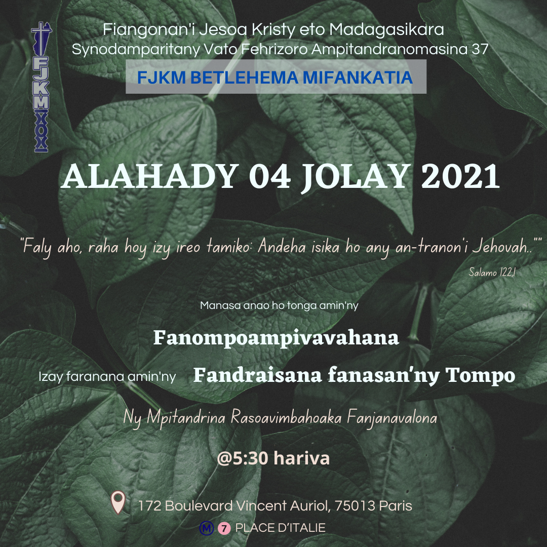 FJKM Betlehema Mifankatia Paris Ny Mpitandrina RASOAVIMBAHOAKA Fanjanavalona tel: 07 49 43 23 85
